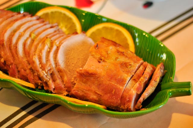 When I got home, I was so inspired, I started marinating the two ducks, using sage, thyme, lemon zest, orange zest and salt. Then, I made slits on the pork loin and inserted garlic cloves, and seasoned it with adobo seasoning ( only the Goya brand, I tested the others, they do not compare to the Goya ), garlic salt and lemon zest. I baked it at 325 F and after an hour, the pork loin was done. I tasted a slice and it was so right on..just enough citrus, just enough garlic and just enough salt.